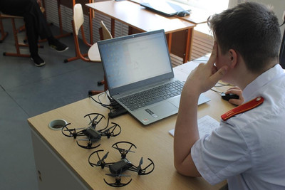 Далее они уже работают на компьютерах. Ребята узнают как с помощью приложения DroneBlocks можно управлять беспилотником. Но для этого они проходят курс программирования на Code Studio (это онлайн-продукт для обучения детей основам программирования, в котором обучение проходит в игровой форме).
